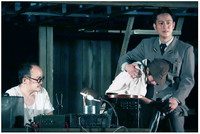 En cuanto a la trama, no haré muchos spoilers, no porque nadie que me lea vaya a ir a ver esto al teatro, que lo dudo mucho, jajaja. Si no porque tampoco me he enterado de los matices, mi japonés apesta, y ellos a veces decían palabras raras que yo no entendía (pero gracias a este butai he aprendido a decir el equivalente a "zafarrancho de combate" en japonés, que de seguro la voy a usar mucho en el futuro, jajajaja). Pero eso, que pillé la historia a grandes rasgos y algunos de los chistes, otros se me escapaban (joder, me enteré muchísimo más en el Endless Shock, usaban un japonés más normal). La historia empieza en 1944, están preparando un barco para salir al Pacífico en una misión como de "espiar" o ver lo que se cuece con los americanos y avisar si pasa algo. Por lo que parece en aquella época en Japón cualquier barco "normal" era susceptible de ser tomado por el ejército para alguna misión si hacía falta, porque la mitad de la tripulación son civiles, de hecho unos pobres pescadores que no saben nada de la guerra. Esa es la impresión que me dio a mí, que conste que el experto en saber cosas de las guerras es mi hermano, a lo mejor estoy metiendo la pata con esto, jajaja. Pero eso, en principio son 5 pescadores de un barco que les vienen los militares y se los llevan con ellos en una misión.