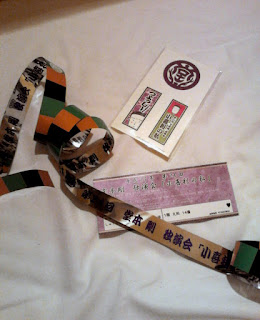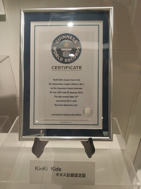 Busque el hall c y me puse a hacer cola, al llegar veo un cartel que pone que SOLO se puede comprar 1 clearfile por persona, a mí me habían encargado 2... ¡PROBLEMA!. Y suerte que yo había decidido que me iba a comprar para mí solo el uchiwa, porque soy una gran coleccionista de clearfiles, suelo comprar mucho eso en los conciertos. Total, que tuve que comprar los goods en una fila, meter todo en la maleta disimuladamente, seguir para delante, y hacer la cola otra vez en otro stand para pedir lo que me faltaba. :p (Yo me paso las normas por ahí, un encargo es un encargo!). Fijándome que ninguno de los chicos del staff que había vigilando se diera cuenta, porque esa es otra, no había ni una puñetera occidental, así que podía llamar su atención sin querer. por suerte NO me pillaron, ¡el crimen perfecto! Al otro lado de los stands había una exposición sobre el último concierto de los kinki (lo de diciembre) y estaban TODOS los trajes que llevaron en unos maniquíes, ponía que NO se podía hacer fotos...así que las hice como pude sin que me vieran los de seguridad, la mayoría quedaron movidas y como el culo. Estas dos que pongo son las que mejor quedaron... así que imaginad el resto. o_0 Lo que sí pensaba al ver los trajes puestos en los maniquíes (además de: "esto igual tiene restos de adn de ellos y puedo clonar a Tsuyo" era "qué bajitos son, y que delgadísimo es Koichi, si le entran esos pantalones tiene las piernas como dos palitos!" :o