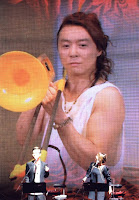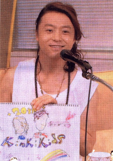 Tsuyoshi dibujaba mierdas mientras Koichi cantaba en el escenario porque ese hombre NO SE PUEDE ESTAR QUIETO NI CINCO MINUTOS. Ese es Yoshida-san el "líder" de la banda que acompaña a los kinki en los conciertos desde tiempos inmemoriales. A nada que seáis fans de los kinki y hayáis visto un par de conciertos en dvd os habéis tenido que fijar en el hombre que toca la guitarra y lleva siempre sombreros con una pluma, jejeje.