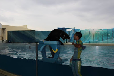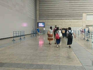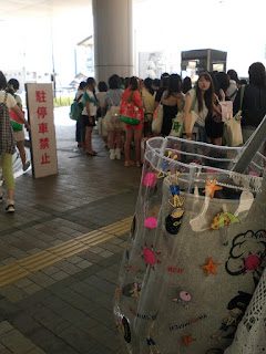 En el papel de la entrada ponía que era el hall de un lugar llamado "pacífico", en el paseo marítimo busqué un cartelón de esos de "usted está aquí" para orientarme y vi hasta el edificio ese llamado pacífico había más de un kilómetro a pie. Y ya venía de caminar un rato... total que con todo el calor del mundo, tirando de la maletita con ruedas y secándome con mi mini toalla de la prima de hello kitty me caminé todo el trecho, me tuve q subir las escaleras de a un cruce sobre la carretera que había pensando "espero haberme orientado antes con el mapa y estar yendo BIEN al sitio", de vez en cuando veía que volvían chicas con el uchiwa en la mano o algún otro good y pensé "si están tan lejos del estadio con esto, es que vienen de comprarlo". Seguí para delante y ya tras pasar un parque de atracciones, tiendas, hoteles, y dejara un lado lo que parecía un centro comercial muy pijo vi el sitio y me metí dentro, al menos en el edificio no hacía calor.