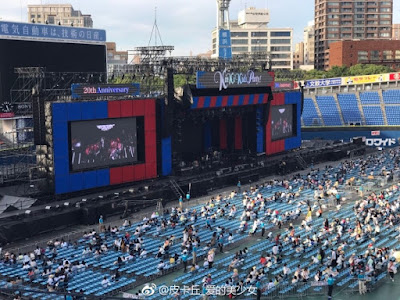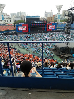 Una vez dentro del estadio de Yokohama vi que me habían dado lo que yo en mi mente llamé "el asiento marginal". Estaba como a mitad de las stands, de hecho eso que se ve a mis pies es el pasillo que dividía las 2 secciones, pero ahí viene lo raro, mi asiento era el último de ese bloque por lo que tenía las escaleras a mi izquierda, pero...entre mi asiento y el de la otra persona del mismo bloque de esa fila, HABÍA 2 HUECOS. Vamos, 2 asientos que no existían, de hecho aproveche para poner mi maletita de ruedas en el hueco entre los dos asientos, y la mujer que había al otro lado puso su bolsa tb. Seguro que me dieron el asiento marginal porque soy negra... T_T De todos modos estaba guay estar ahí porque a ratos si quería durante el concierto no me tenía que levantar si no me apetecía, porque aunq las de la fila de delante se levantaran, yo veía el escenario perfectamente. En las pantallas durante todo el tiempo antes de empezar el concierto andaban poniendo un montón de vídeos. Este mes los kinki tenían MUCHO que promocionar, así que salía el anuncio de joyas ese para el que les han contratado, el trailer del dorama especial de "Bokura no yuuki", la versión corta del pv de "the red light", un anuncio del próximo bunbubun que iban a echar y un anuncio bastante largo del programa especial "Love Love aishiteru". A ratos se oía de fondo la música del dorama summer snow (natsu no ousama) por los altavoces y yo ya estaba "no me pongáis esto, que lloro" T_T (los que hayan visto ese dorama ya saben de lo que hablo)
