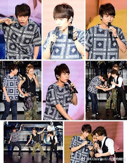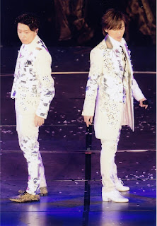 A las 6,40 Koichi anunció que habían llegado "unos invitados", y entro por el lateral izquierdo del escenario Tackey con un sexy zone que he tenido que buscar el nombre porque ni idea...Sato Shori se llama el chaval. ¿? Koichi se puso en plan adulador con Taki diciéndole lo kakkoii que le parece noseque y nosecuantos. Le preguntó la edad al Sato ese y le dice que tiene 20 años. Koichi asombrado "cuando tu naciste yo estaba debutando", pregunta al público si hay gente de la edad de ese chico y se oyen voces gritando. Va y les dice algo así como "y qué hacéis viniendo a ver a unos señores viejos como nosotros, id a ver a sexy zone" (Koichi, NO ECHES A TUS PROPIOS FANS DEL CONCIERTO!). Taki dice que él en sus épocas de junior había hecho alguna vez de backdancer de kinki kids, y menciona la canción "Friends", entonces Koichi le pregunta qué bailaba ahí, y dice que nada, que en esa canción solo se sentaba en unas escaleras con otros juniors mientras los kinki cantaban y movían la cabeza de un lado a otro. Entonces Koichi le dice que tienen ahí unas escaleras y Taki en plan Ahhh natsukashii... ("qué recuerdos") y yo pensando, ¿Takizawa es tonto o qué, tanto ha echao de menos sentarse en una escalera, en su casa no tiene? Jajajajaja. Sato-kun dijo que él empezó de backdancer de los JUMP.![]() |