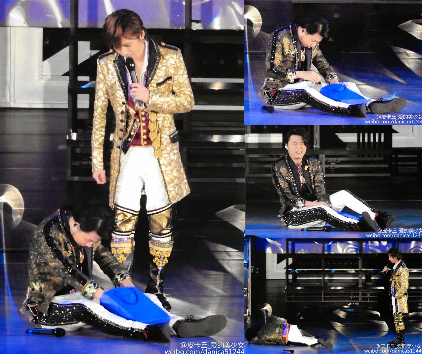Pero claro, yo desde mi asiento del palco de arriba NO veían bien los detalles... y en las papapics que he encontrado se ven cosas muy cutres, la verdad... :-/ Vamos, que tenía el pantalón ya un poco... de aquellos modos, que se le habían caído las lentejuelas de la zona de los muslos... Y cuando se tiró en el suelo se le vio que lo tenía lo roto. ^_^U Si es que claro, este hombre es "de culo generoso" y no va mal de muslos tampoco, así que del rozamiento, pues se le habrán caído (que ya llevaba 8 o 9 conciertos con ese! Es mucho trajín). Pero vamos, que cuando lo he visto me ha dado un poco de vergüenza ajena, Tsuyoshi, que "se supone" que eres un idol, no puedes salirme a los escenarios hecho un pordiosero!! >_<