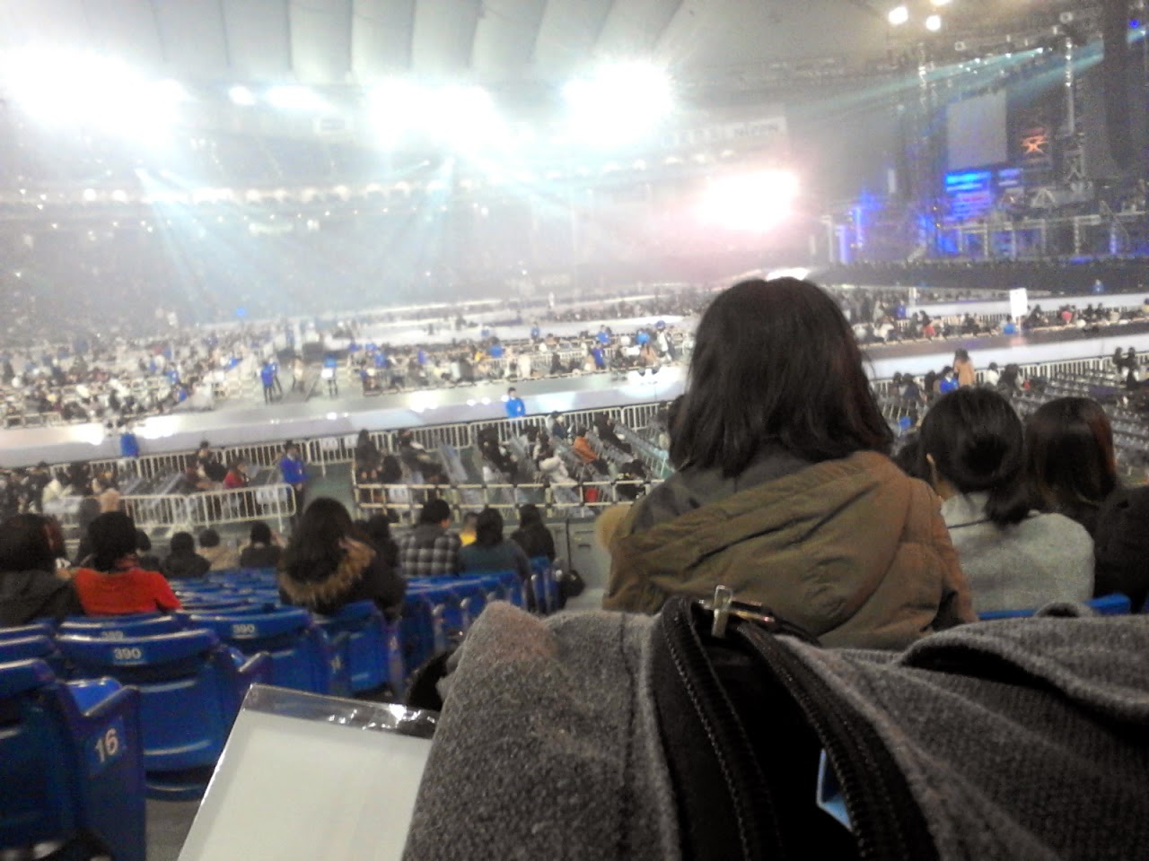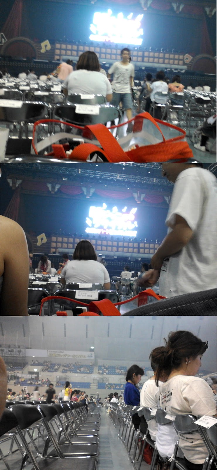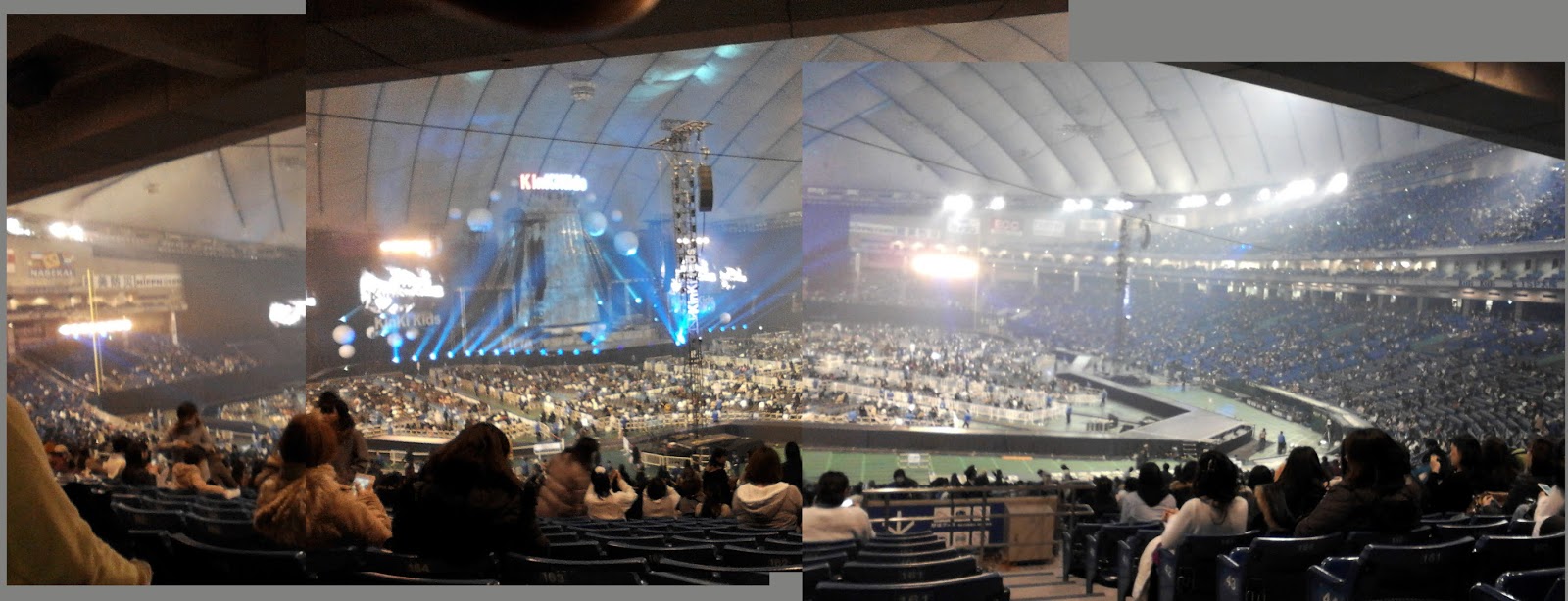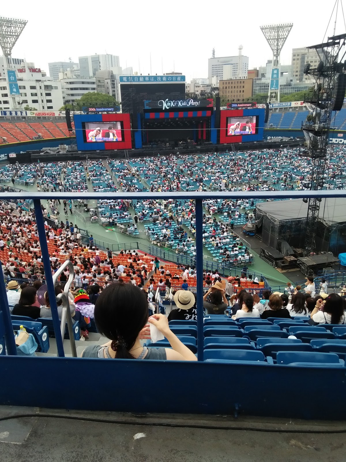 Una vez dentro del estadio de Yokohama vi que me habían dado lo que yo en mi mente llamé "el asiento marginal". Estaba como a mitad de las stands, de hecho eso que se ve a mis pies es el pasillo que dividía las 2 secciones, pero ahí viene lo raro, mi asiento era el último de ese bloque por lo que tenía las escaleras a mi izquierda, pero...entre mi asiento y el de la otra persona del mismo bloque de esa fila, HABÍA 2 HUECOS. Vamos, 2 asientos que no existían, de hecho aproveche para poner mi maletita de ruedas en el hueco entre los dos asientos, y la mujer que había al otro lado puso su bolsa tb. Seguro que me dieron el asiento marginal porque soy negra... T_T De todos modos estaba guay estar ahí porque a ratos si quería durante el concierto no me tenía que levantar si no me apetecía, porque aunq las de la fila de delante se levantaran, yo veía el escenario perfectamente. En las pantallas durante todo el tiempo antes de empezar el concierto andaban poniendo un montón de vídeos. Este mes los kinki tenían MUCHO que promocionar, así que salía el anuncio de joyas ese para el que les han contratado, el trailer del dorama especial de "Bokura no yuuki", la versión corta del pv de "the red light", un anuncio del próximo bunbubun que iban a echar y un anuncio bastante largo del programa especial "Love Love aishiteru". A ratos se oía de fondo la música del dorama summer snow (natsu no ousama) por los altavoces y yo ya estaba "no me pongáis esto, que lloro" T_T (los que hayan visto ese dorama ya saben de lo que hablo)