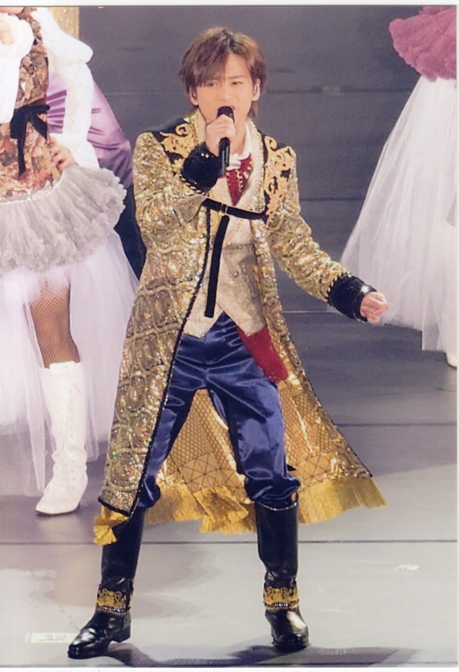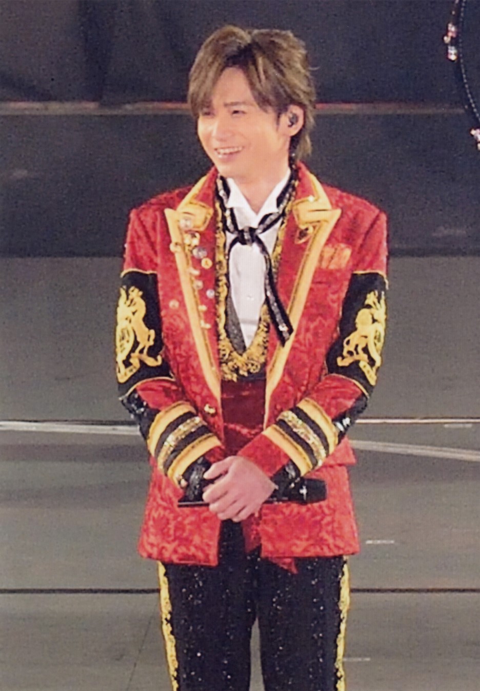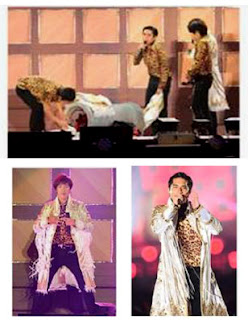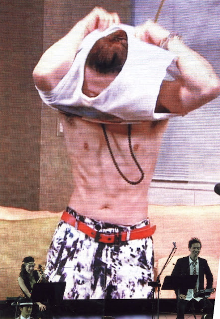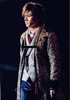 Pero claro, yo desde mi asiento del palco de arriba NO veían bien los detalles... y en las papapics que he encontrado se ven cosas muy cutres, la verdad... :-/ Vamos, que tenía el pantalón ya un poco... de aquellos modos, que se le habían caído las lentejuelas de la zona de los muslos... Y cuando se tiró en el suelo se le vio que lo tenía lo roto. ^_^U Si es que claro, este hombre es "de culo generoso" y no va mal de muslos tampoco, así que del rozamiento, pues se le habrán caído (que ya llevaba 8 o 9 conciertos con ese! Es mucho trajín). Pero vamos, que cuando lo he visto me ha dado un poco de vergüenza ajena, Tsuyoshi, que "se supone" que eres un idol, no puedes salirme a los escenarios hecho un pordiosero!! >_<