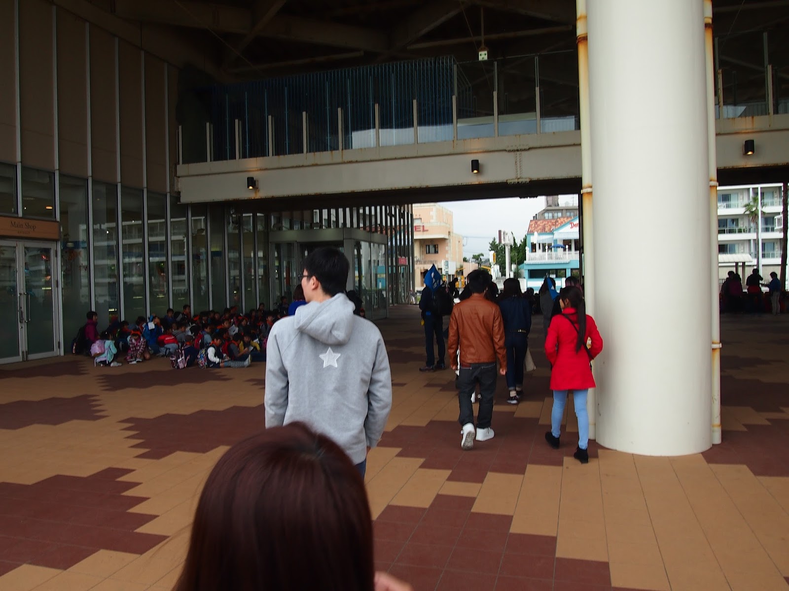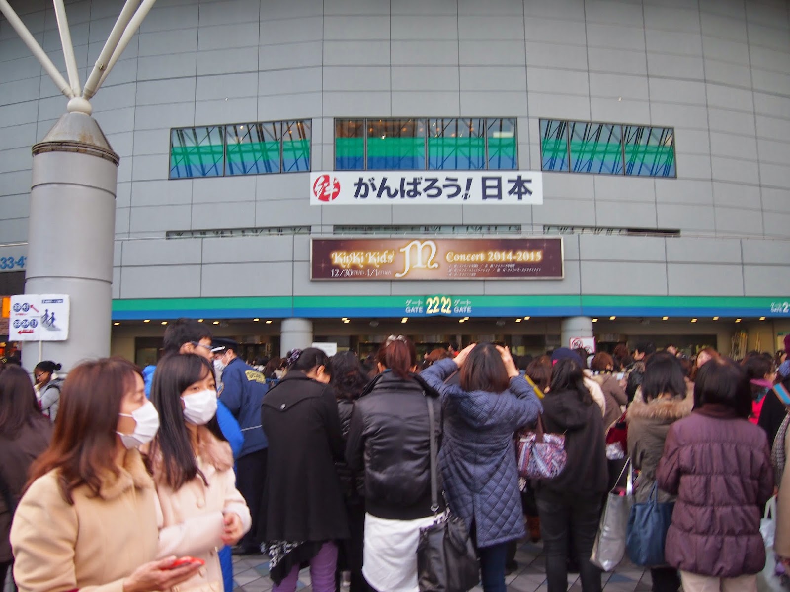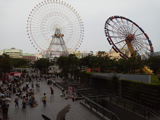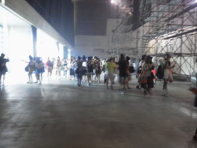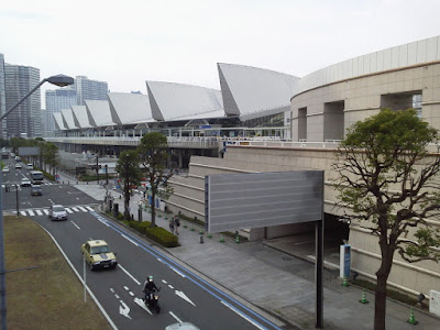 En el papel de la entrada ponía que era el hall de un lugar llamado "pacífico", en el paseo marítimo busqué un cartelón de esos de "usted está aquí" para orientarme y vi hasta el edificio ese llamado pacífico había más de un kilómetro a pie. Y ya venía de caminar un rato... total que con todo el calor del mundo, tirando de la maletita con ruedas y secándome con mi mini toalla de la prima de hello kitty me caminé todo el trecho, me tuve q subir las escaleras de a un cruce sobre la carretera que había pensando "espero haberme orientado antes con el mapa y estar yendo BIEN al sitio", de vez en cuando veía que volvían chicas con el uchiwa en la mano o algún otro good y pensé "si están tan lejos del estadio con esto, es que vienen de comprarlo". Seguí para delante y ya tras pasar un parque de atracciones, tiendas, hoteles, y dejara un lado lo que parecía un centro comercial muy pijo vi el sitio y me metí dentro, al menos en el edificio no hacía calor.