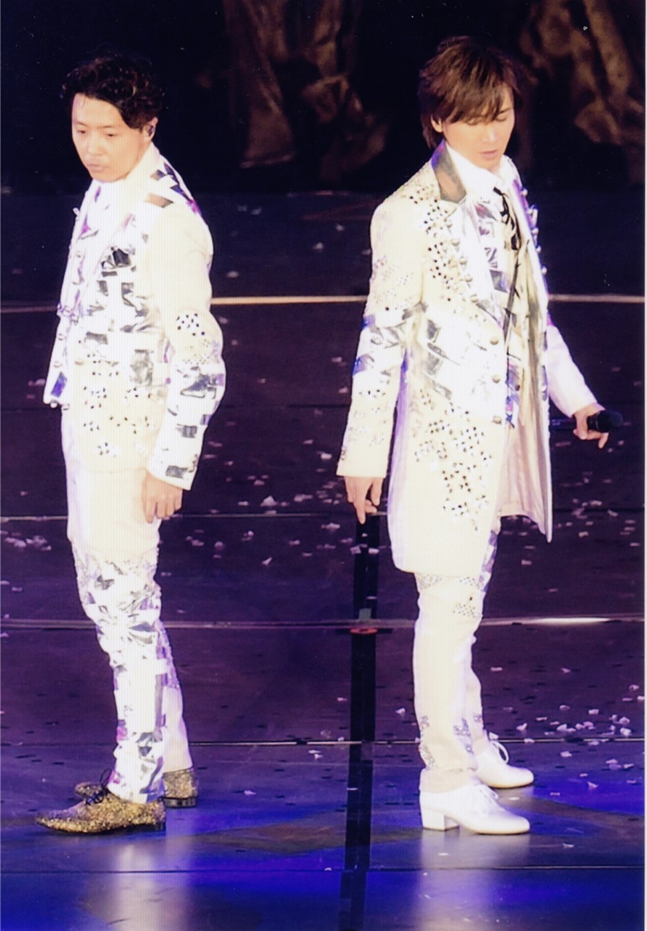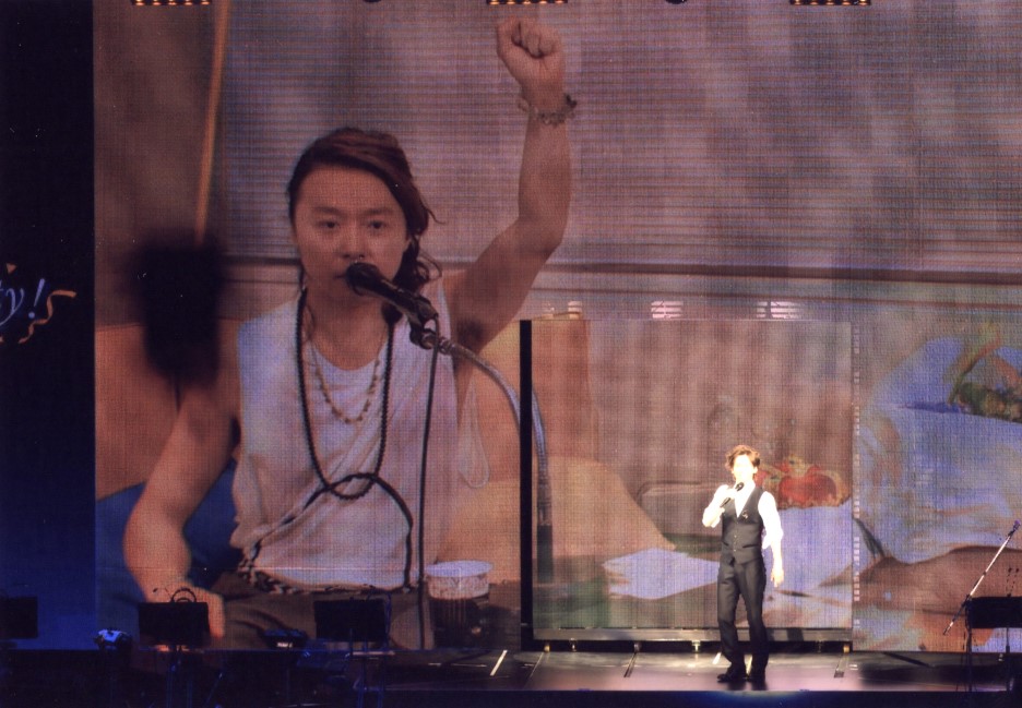 Se pusieron a hacer un MC largo hablando de todo un poco, preguntaron si había fans chicos y los hombres del estadio gritaron. De pronto va Tsuyoshi y pregunta "alguno trabaja de cerrajero? Para abrirme estos candados" y señalaba los grilletes" ¡Jajajaja!. :p Recordaron actuaciones viejas, Koichi tenía un cuaderno con cosas escritas, como canciones y actuaciones, pusieron varios trozos en las pantallas, como por ejemplo una actuación del Bonnie butterfly del G Tour (año 2004, en el que por cierto Tsuyo llevaba el pelo bastante largo tb). Una canción que no me sonaba de nada (y por lo que he investigado jamás ha salido en un disco de kinki) que se llama maketara akan, la actuación era del año 97 así os podéis imaginar la pinta de críos que tenían, recién debutados. También pusieron otra actuación vieja del 99 en la que salían vestidos con uniformes de baseball (me apuntaba los nombres de las canciones porque salían en la pantalla, pero eran autenticas viejadas, no sé si seré capaz de encontrarlas en internet). Tsuyo dijo que en donde estaba se estaba fresco (como presumiendo de aire acondicionado, no como nosotros en el estadio que hacía calor), pero lo cierto es que no tardó mucho más de media hora larga en quitarse la chaqueta, no olvidemos que es "don calores" jajaja.
