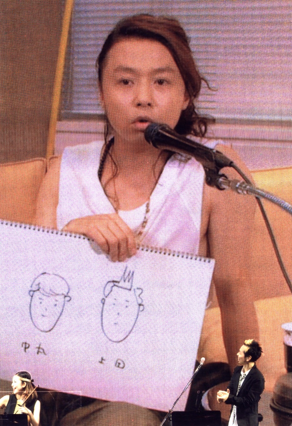 Tsuyoshi dibujaba mierdas mientras Koichi cantaba en el escenario porque ese hombre NO SE PUEDE ESTAR QUIETO NI CINCO MINUTOS. Ese es Yoshida-san el "líder" de la banda que acompaña a los kinki en los conciertos desde tiempos inmemoriales. A nada que seáis fans de los kinki y hayáis visto un par de conciertos en dvd os habéis tenido que fijar en el hombre que toca la guitarra y lleva siempre sombreros con una pluma, jejeje.