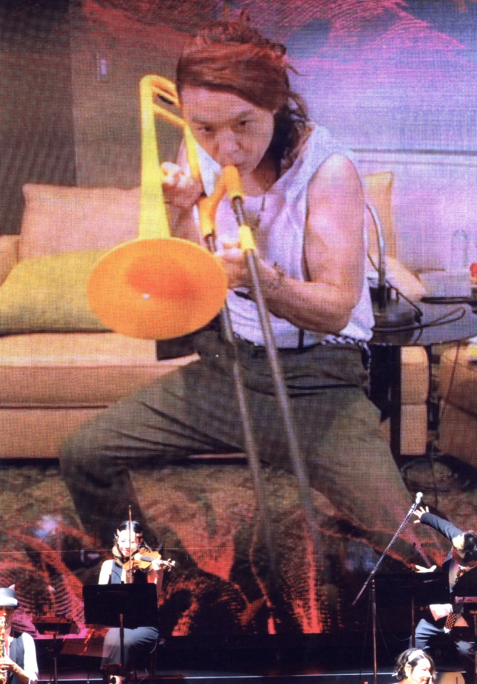 Koichi da las gracias, despide a los invitados y prosiguen con el concierto, le pregunta a Tsuyo si puede "tocar el trombón", si es malo para su oído soplar, Tsuyoshi se pone a rebuscar por la habitación el trombón que le regaló Kouchan hace 2 navidades, se ve que alguien del staff que está en la habitación con él se lo da. Estaba con la varilla sin poner, se pone a armarlo, primero se equivoca y lo estaba poniendo al revés. Que van a cantar "bara to taijou", Koichi nos vuelve a pedir que cantemos con él. Nosotros la parte de Tsuyo. ^_^