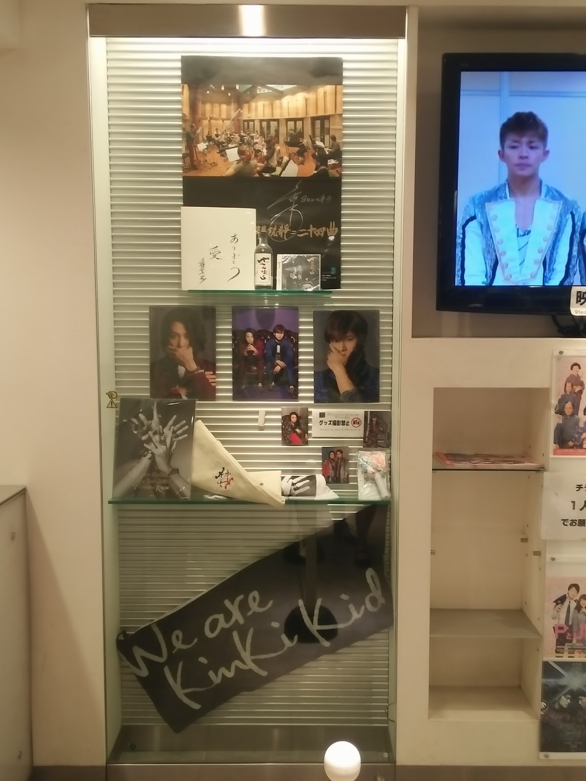 Busque el hall c y me puse a hacer cola, al llegar veo un cartel que pone que SOLO se puede comprar 1 clearfile por persona, a mí me habían encargado 2... ¡PROBLEMA!. Y suerte que yo había decidido que me iba a comprar para mí solo el uchiwa, porque soy una gran coleccionista de clearfiles, suelo comprar mucho eso en los conciertos. Total, que tuve que comprar los goods en una fila, meter todo en la maleta disimuladamente, seguir para delante, y hacer la cola otra vez en otro stand para pedir lo que me faltaba. :p (Yo me paso las normas por ahí, un encargo es un encargo!). Fijándome que ninguno de los chicos del staff que había vigilando se diera cuenta, porque esa es otra, no había ni una puñetera occidental, así que podía llamar su atención sin querer. por suerte NO me pillaron, ¡el crimen perfecto! Al otro lado de los stands había una exposición sobre el último concierto de los kinki (lo de diciembre) y estaban TODOS los trajes que llevaron en unos maniquíes, ponía que NO se podía hacer fotos...así que las hice como pude sin que me vieran los de seguridad, la mayoría quedaron movidas y como el culo. Estas dos que pongo son las que mejor quedaron... así que imaginad el resto. o_0 Lo que sí pensaba al ver los trajes puestos en los maniquíes (además de: "esto igual tiene restos de adn de ellos y puedo clonar a Tsuyo" era "qué bajitos son, y que delgadísimo es Koichi, si le entran esos pantalones tiene las piernas como dos palitos!" :o