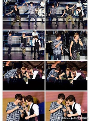 A las 6,40 Koichi anunció que habían llegado "unos invitados", y entro por el lateral izquierdo del escenario Tackey con un sexy zone que he tenido que buscar el nombre porque ni idea...Sato Shori se llama el chaval. ¿? Koichi se puso en plan adulador con Taki diciéndole lo kakkoii que le parece noseque y nosecuantos. Le preguntó la edad al Sato ese y le dice que tiene 20 años. Koichi asombrado "cuando tu naciste yo estaba debutando", pregunta al público si hay gente de la edad de ese chico y se oyen voces gritando. Va y les dice algo así como "y qué hacéis viniendo a ver a unos señores viejos como nosotros, id a ver a sexy zone" (Koichi, NO ECHES A TUS PROPIOS FANS DEL CONCIERTO!). Taki dice que él en sus épocas de junior había hecho alguna vez de backdancer de kinki kids, y menciona la canción "Friends", entonces Koichi le pregunta qué bailaba ahí, y dice que nada, que en esa canción solo se sentaba en unas escaleras con otros juniors mientras los kinki cantaban y movían la cabeza de un lado a otro. Entonces Koichi le dice que tienen ahí unas escaleras y Taki en plan Ahhh natsukashii... ("qué recuerdos") y yo pensando, ¿Takizawa es tonto o qué, tanto ha echao de menos sentarse en una escalera, en su casa no tiene? Jajajajaja. Sato-kun dijo que él empezó de backdancer de los JUMP.![]() |