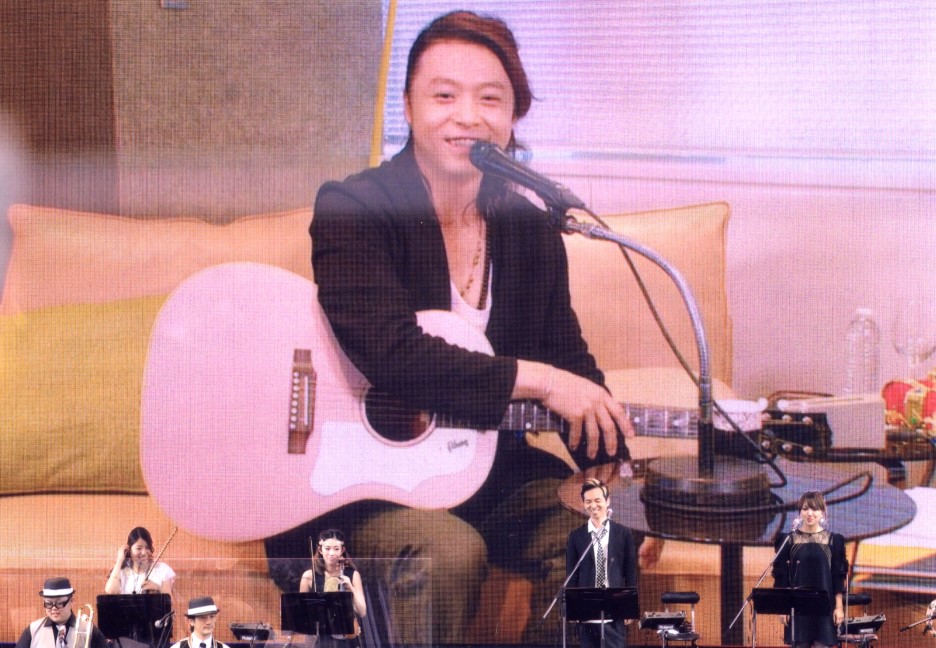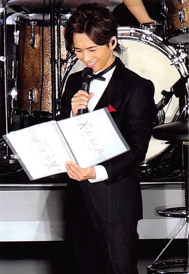 Decidieron hacer un experimento, cantar los 2 "juntos" una canción, el problema es que a Tsuyoshi el sonido le llegaba con un poco de retardo, a ver si eran capaces de solucionarlo sobre la marcha, es decir, para cuando a él le llegaba al estudio (o donde demonios estuviera) la música, igual hacía 2 segundos que tenía que haber empezado a cantar su parte, así que iba a ser cantar a ciegas (y en su caso un poco a sordas, no?). No tenían muy claro si iba a salir bien, la cosa era que Tsuyoshi más que fiarse de la pantalla de tv que tenía delante en la que veía el concierto, tenía que mirar a los miembros del staff que le avisaban cuando empezar a cantar cada parte, para que coincidiera bien con la música en directo de la banda en el estadio. La canción que escogieron me hizo mucha ilusión porque es una de mis canciones favoritas de kinki (y de las que mas me gustan en general del mundo entero). Tsuyoshi se levantó para cantar y decía que era un poco triste estar el allí cantando solo, que parecía que estaba en una cabina de karaoke, jajajaja. Cantaron Mou kimi igai aisenai al principio Tsuyo iba un poco a destiempo, pero a mitad de canción consiguieron cuadrarlo y ya cantaba coincidiendo con la música casi perfecto, les quedó muy bonito (a mí es que esa canción me emociona mucho, y por suerte se la he podido escuchar más de una vez en directo estos años, lo cual es una rareza, porque se habían pasado muchos años sin incluirla en sus conciertos)